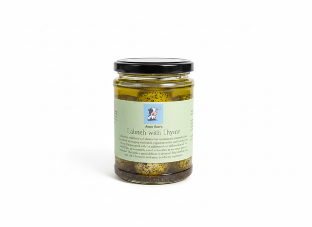 Labneh is a traditional soft cheese that is commonly prepared in Arab households by hanging whole milk yogurt in muslin until it is thick and creamy. It is preserved with the addition of salt and stored in oil. The labneh balls are commonly served at breakfast or as a snack spread in some bread. They make a great addition to any meal. This labneh is tangy, salty and is flavoured with mint. Suitable for vegetarians.